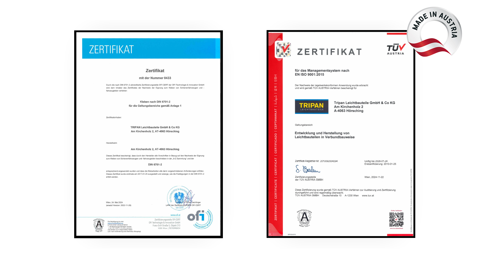 Our certificates are our statement for first-class certified quality. Thus, you can be absolutely sure that all tests have been performed and returned positive results according to the guidelines. TRIPAN lightweight solutions are guaranteed to be certified quality products “MADE IN AUSTRIA“.